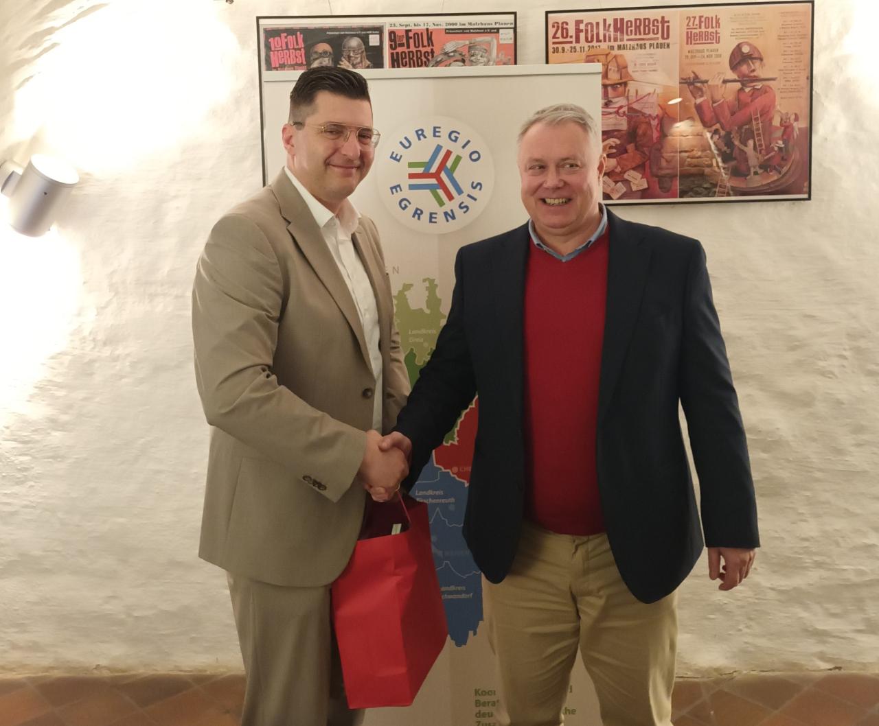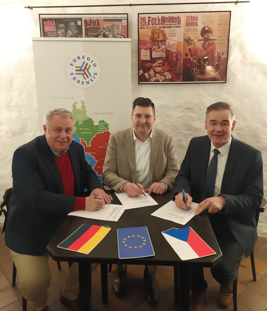 Na zasedání společného prezídia Euregia Egrensis 26. února v Plavně převzal místostarosta města Cheb Michal Pospíšil na příštích několik měsíců funkci společného prezidenta od dosavadního držitele této funkce, krajského hejtmana Thomase Henniga z Vogtlandského okresu. Takzvaný společný prezident Euregia Egrensis zastupuje po určitou dobu celé Euregio navenek, vždy střídavě mezi pracovními skupinami. Prezidenti tří pracovních skupin Euregio Čechy, Sasko/Durynsko a Bavorsko podepsali v Plauen stanovisko k období financování EU 2028–2035. Michal Pospíšil, Thomas Hennig a Peter Berek (zleva doprava) v něm požadují posílení pohraničních regionů a zachování podpory INTERREG. Kromě toho chtějí, aby Euregia zůstala zapojena do realizace programů INTERREG a aby byla pro své administrativní úkoly finančně dostatečně vybavena. Za pracovní skupinu Euregio Egrensis Bavorsko poblahopřál prezident a krajský hejtman Peter Berek a přislíbil panu Pospíšilovi svou podporu i podporu bavorské strany.